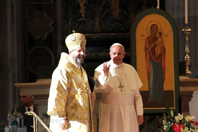 Після Архиєрейської Святої Літургії, яку Блаженніший Святослав очолив на головному престолі ватиканської базиліки, привітати українських прочан прибув Папа Франциск. Його прихід вірні зустріли співом гімну «Будь, ім’я Господнє, благословенне!» та гучними оплесками.